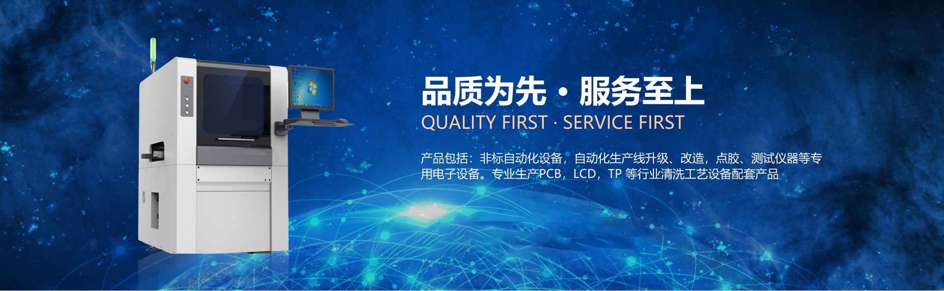 產品包括:非標自動化設備,自動化生產線升級、改造,點膠、測試儀器等專用電子設備。專業生產PCB,LCD,TP等行業清洗工藝設備配套產品